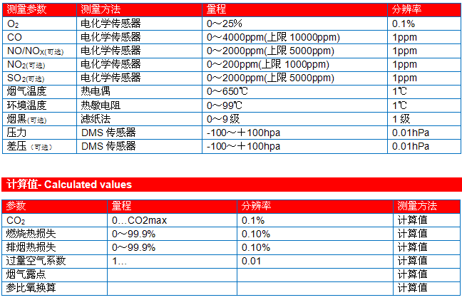 O2 (0-21%)、CO (0-4000 ppm; H2-補償)、NO (0-5000ppm), 空氣溫度 (0-99°C),煙氣溫度 (0-500°C),通風 (± 100 hPa),不同壓力 (± 100 hPa) 通過可選壓力管。